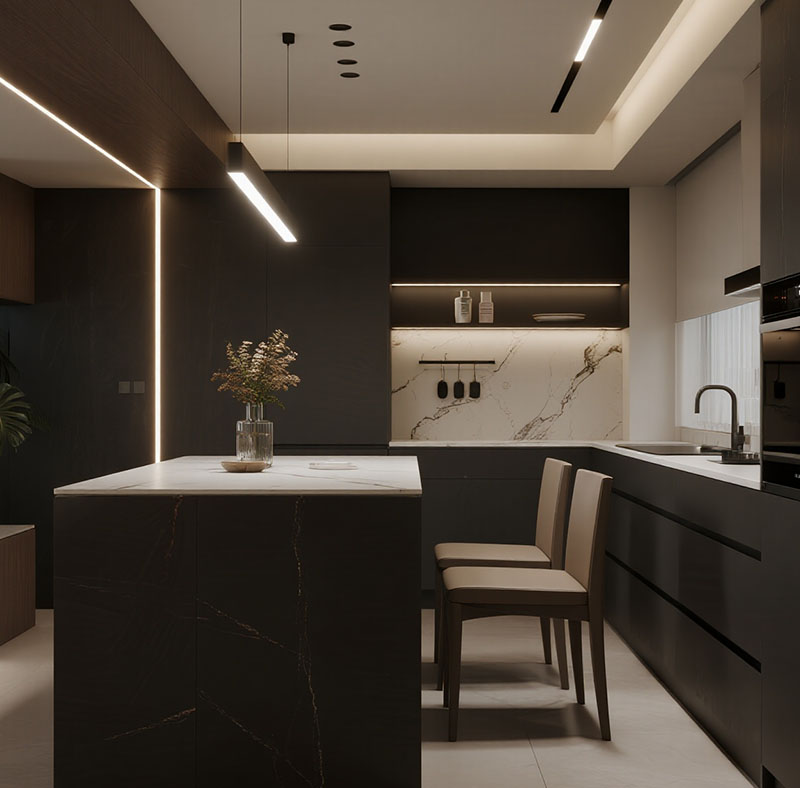 5 mm 超薄不銹鋼巖板復合背景墻,在 2700 K 燈帶下泛起綢緞般柔光。電視隱于滑軌,壁爐嵌入凹槽,金屬的冷冽與火焰的溫度,在一面墻上握手言和。